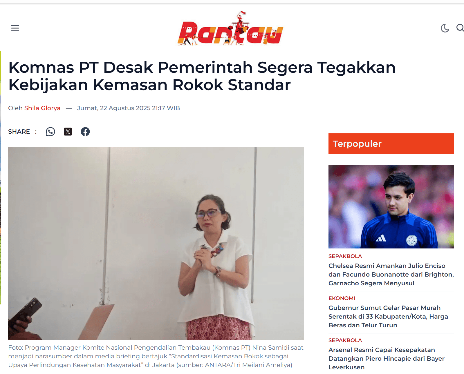 Pantau – Program Manager Komnas PT Nina Samidi menegaskan bahwa Pemerintah Indonesia harus segera menegakkan kebijakan kemasan rokok standar tanpa penundaan demi melindungi kesehatan masyarakat.